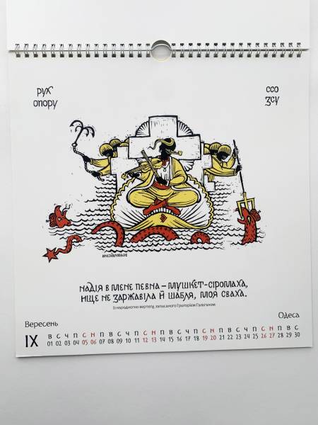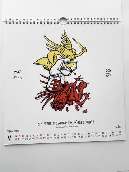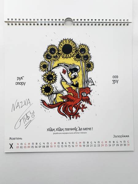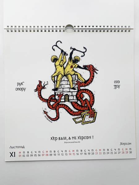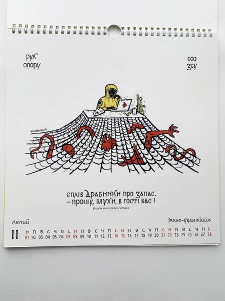У календарі навіть з’явилось зображення на честь спецоперації зі знищення російського стаціонарного трасового радіолокаційного комплексу ТРЛК-10 «Скала-М», що був розташований в Абрикосівці в Криму. Ворожий об’єкт тут відтворено в подобі «Ока Саурона», яке дзьобає ворон — один із символів Руху опору.