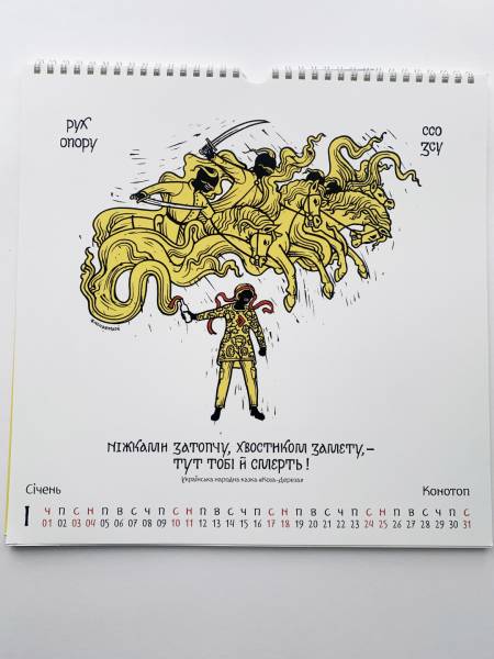 «Боротьба є не тільки збройною, але й культурною та інформаційною. З цієї причини у календарі подані також Львів, Київ та Івано-Франківськ — міста, які формують смисловий простір протистояння», — пояснив Скоп.