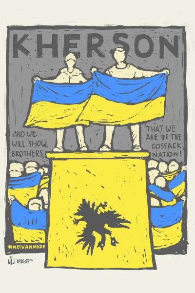 "У муралі в Сумах я «відродив» зруйнований монумент Тарасові Шевченку авторства Івана Кавалерідзе. Конотоп — це образ української жінки у світшоті, декор якого імітує орнаментику ікон Сорочинського іконостасу. Полум’я з бандера-смузі відсилає до козаків, які розбили московитів під час Конотопської битви 1659 року. Херсон віддзеркалює малюнок, створений на основі історичного фото 2022 року, на якому двоє херсонських хлопців тримають українські стяги на постаменті в день визволення міста. Розкидані внизу картини — згадка про викрадення окупантами колекції Херсонського художнього музею", – розповів митець.