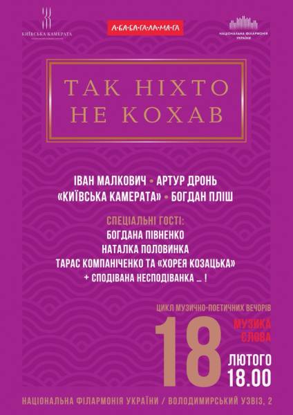 У Києві відбудеться музично-поетичне дійство «Так ніхто не кохав» 15.02.2026 20:34 Укрінформ У Національній філармонії України 18 лютого о 18:00 пройде музично-поетичне дійство «Так ніхто не кохав», яке об’єднає симфонічну та вокальну музику з визначною та актуальною українською лірикою про кохання.
