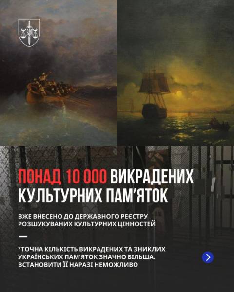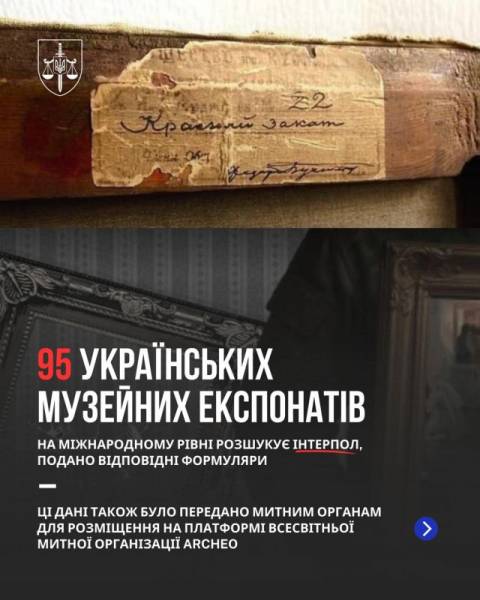«Для міжнародного пошуку викрадених об’єктів Офісом генерального прокурора надіслано до Департаменту міжнародного поліцейського співробітництва Національної поліції України 650 відповідних анкет. Вже внесено у відповідні бази Інтерполу 95 об'єктів, діяльність з їх поповнення продовжується», – додали у відомстві.