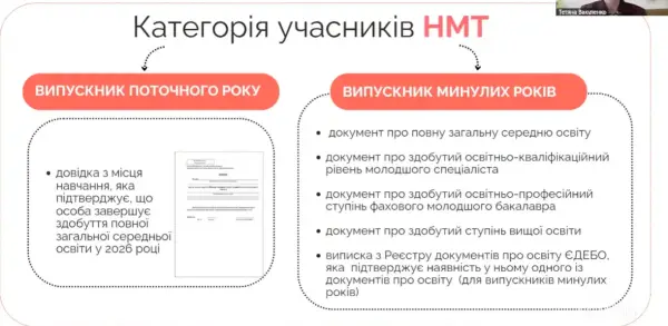 Вакуленко також відзначила, що ті, хто закінчив школу в минулі роки та бажають брати участь у НМТ, вже мають вищезгадану освіту. Вони також повинні надати документ, що це підтверджує.