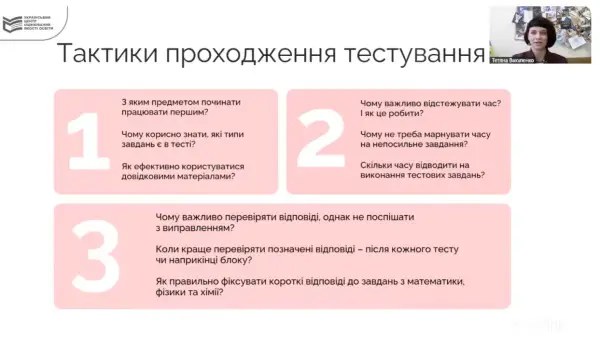 І додала, що під час підготовки до іспиту варто приділити увагу тактиці проходження тесту. Зокрема, на питання про застосування довідкових матеріалів, або з чого починати – з мови чи з математики. А також на те, чи переходити від одного предмета до іншого у межах одного блоку.